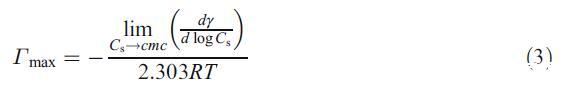 NP 溶液在不同 hp-β-CD 浓度下的界面张力(γ)如图 1 所示。在任何 hp-β-CD 浓度下,界面张力随着 NP 的增加而降低。 Hp-β-CD 由七个葡萄糖单元组成,形成一个具有亲水外表面和疏水内腔的环,众所周知,它主要以 1:1 的化学计量将客体分子结合到疏水腔中 [11]。 在 hp-β-CD 的水溶液中,NP 被认为结合了 hp-β-CD 的疏水腔。 众所周知,Hp-β-CD 由于其亲水性外表面而不吸附在空气-溶液界面。 这表明未掺入 hp-β-CD 腔的 NP 分子吸附在空气 - 溶液界面。 在任何 hp-β-CD 浓度下均未观察到表明胶束化开始的断点(即临界胶束浓度 (cmc))。 由于 NP 非常疏水,体相中的 NP 单体浓度不能增加到 cmc。 根据 γ 与 log CS,非离子 NP 的最大表面过量 (Γmax) 通过 Gibb 吸附方程估计如下 [12]: