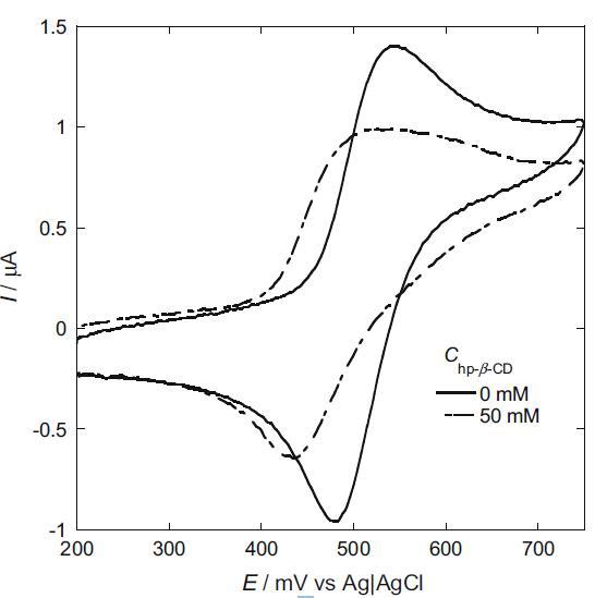 在这里,蜜桃性爱视频网站选择 I2/I− 作为电化学探针,因为 I− 的电荷有望使其与阳离子胶束的结合变得容易,并且电中性 I2 有望在胶束中表面活性剂的疏水部分之间增溶并溶解在电极表面的表面活性剂单层中。 蜜桃性爱视频网站研究了 hp-β-CD 对 I2/I- 氧化还原峰的影响(图 5)。 在没有 hp-β-CD 的情况下,观察到 I- 在约 530 mV 处的阳极峰和 I2 在约 480 mV 处的阴极峰。 在 50 mM hp-β-CD 存在下,阳极和阴极峰值电流均降低,并且它们的峰值电位向负方向移动。 阳极峰值电流的降低是由 I− 与 hp-β-CD 的亲水表面结合引起的。 另一方面,阴极峰值电流的降低是由 hp-β-CD 疏水腔中包含 I2 引起的 [18]。 峰值电位的负移表明结合在 hp-β-CD 腔中的 I2 比结合到 hp-β-CD 表面的 I- 更稳定。