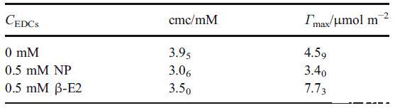 表 2 在含有 0.49 M Na2SO4 和 0.01 M H2SO4 的 5 mM hp-β-CD 存在下,HTA+ 溶液在不同 NP 或 β-E2 浓度下的 cmc 和表面过量 (Γmax) 值