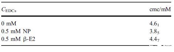 表 3 在含有 20 mM 磷酸盐缓冲液和 0.5 μM 芘的 50 mM hp-β-CD 存在下,HTAB 溶液在不同 NP 或 β-E2 浓度下的 cmc 值