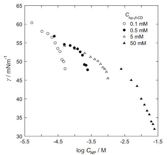 图 1 不同 hp-β-CD 浓度下的界面张力 (γ) vs. log CNP/mol dm-3