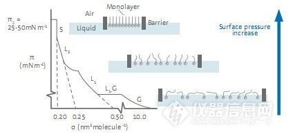 在进行典型的等温压缩测试时,单分子层先从二维的气相(G)转变到液相(L)最后形成有序的固相(S)。在气相中,分子间的相互作用力比较弱;当表面积减小,分子间的堆积更为紧密,并开始发生相互作用;在固相时,分子的堆积是有序的,导致表面压迅速增大。当表面压达到最大值即塌缩点后,单分子层的堆积不再可控。