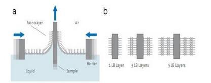 位于气-液或液-液界面处不可溶的功能性分子、纳米颗粒、纳米线或微粒所形成的单分子层可定义为Langmuir膜。这些分子能够在界面处自由移动,具有较强的流动性,易于控制其堆积密度,研究单分子层的行为。将材料沉积在浅池(称顶槽)中的水亚相上,可以得到Langmuir膜。在滑障的作用下,单分子层可以被压缩。表面压力即堆积密度可以通过Langmuir膜分析仪的压力传感器进行控制。