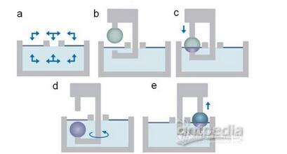 交替型蜜桃成人半夜在线观看的镀膜过程如图3所示。当使用两个单分子层压缩沉积池和一个空白沉积池时,可实现交替镀膜,浸渍过程可在3个沉积池中选择任意路径多次循环(图3a);在共同的亚相(浅蓝色)上方,有两种不同的单分子层(紫色和深蓝色)(图3b);上臂将样品向下通过单分子膜,由下臂接住样品。沉积循环也可从亚相开始,进行第一层镀膜(图3c);下臂可根据需要旋转到另一单分子层的沉积池或空白沉积池中,改变沉积池(图3d);下臂提起样品,传递给上臂(样品从任意一侧通过两个单分子层中任意一个),进行第二层镀膜(图3e)。