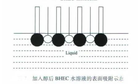 乙醇和正丁醇属于一元醇,这两种醇的加入能使BHEC水溶液的表面张力减小。当未加入一元醇时,BHEC溶于水后,BHEC分子能自发地吸附在溶液的表面,使溶液的表面张力降低,表面吸附的BHEC分子越多,溶液表面张力的降幅越大,当然这其中有一个吸附饱和的问题。但由于BHEC分子在水中处于空间交联网络结构,其定向排列时分子间存在一定的空间(见上图)。加入乙醇或正丁醇后,醇分子可以插入BHEC分子间的空隙,使溶液表面吸附的分子达到紧密排列的状态(见下图),导致BHEC水溶液的表面张力继续降低。