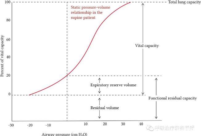 它展示了经典的肺顺应性曲线,在低和高容量时顺应性较差,但在FRC之上,即在正常潮气量的范围内是最佳的。