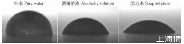 由上式可以看出,基质吸力的大小与表面张力、接触角和曲率半径有关。其中,基质吸力的大小与表面张力成正比,与弯液面曲率半径成反比。因此,表面张力和曲率半径的变化均会导致基质吸力的改变。在环境温度为25℃时,通过JC2000型接触角测量仪对三种试样的孔隙液体进行接触角测量。得到三种不同表面张力液滴的几何形态图如图1所示,测量可得纯水、酒精溶液和肥皂水对应的接触角分别为85°、65°和42°,而在25℃环境下,纯水、20%酒精溶液、2 g L-1肥皂水的表面张力系数分别为:7.1×10-2N m-1、4.1×10-2N m-1、2.9×10-2N m-1。表面张力是决定弯液面形状的主要因素之一,会影响曲率半径和接触角的大小。很显然,表面张力大的液体接触角变大,曲率半径变小。图1中水滴表面张力大于酒精溶液,但形成的弯液面半径却要小于酒精溶液,同样的,酒精溶液形成的弯液面半径又小于肥皂水。曲率半径越小,土体中的基质吸力越大。孔隙水表面张力会对弯液面的曲率半径产生改变从而对基质吸力产生影响,最终影响土壤的收缩开裂。