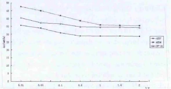 由于表面活性剂分子结构不同,在界面上的吸附速度和溶液的表面张力的降低速度和程度各不相同。由图1可以看出,相同质量分数浓度的AEO7和AEO9、OP-10三种活性剂溶液动态表面张力降至最低值所需时间分别是0.3秒、1.5秒、0.5秒。从疏水基即碳链的长短来看,AEO9和OP-10比较OP-10动态表面张力下降速度快,可以看出碳链越短(AEO9疏水基有12个碳,而OP-10只有8个碳),动态表面张力下降越快,吸附速度越快,达到平衡吸附的时间越短,润湿铺展性能越好。从亲水基即EO数大小来看,AEO7和AEO9比较AEO7动态表面张力下降速度快,可以看出EO数越小(AEO7的EO数7,AEO9的EO数9),活性剂疏水性越强,溶解度减小,吸附到界面的速度增大,动态表面张力下降就越快,润湿扩展性能就好。以上分析可以看出低碳链、低EO数的醇醚具有最佳润湿性能。根据曲线可以看出,AEO7动态表面张力下降速度最快,在0.1秒就降至30.88mN/m,单从快速润湿效果来说,AEO7溶液的润湿性能最佳,但结合印刷对润版液的表面张力35~42mN/m的要求,AEO7控制不好会对油墨乳化产生不利影响。所以OP-10比较适合作为润版液的润湿剂。