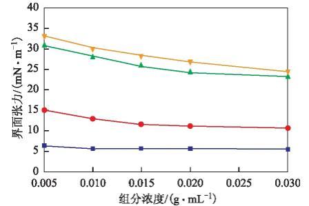 图1 380号燃料油中四组分的油水界面张力曲线饱和分;▲—芳香分;●—胶质;■—沥青质