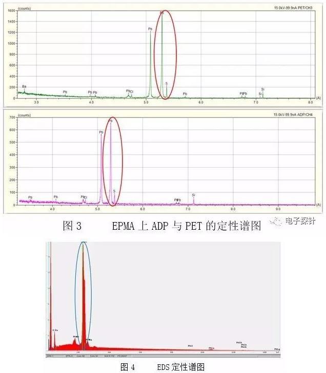 结果显示无论是EPMA-1720上的ADP晶体还是PET晶体,其分辨率都毫无疑问地能把S Ka(特征波长0.5373nm)和Pb Ma(特征波长0.5285nm)明显的区分开来,呈现的是分开的两个峰,见图3中的红色线内。而相同测试条件下的EDS谱图中S Ka峰(特征能量2.308keV)已然不能使用软件自动识别标出,手动添加的结果见图4,其与Pb的Ma峰(特征能量2.343keV)重叠在一起,不能分开。